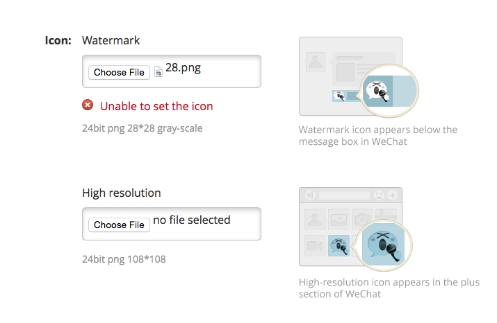 在为iOS注册应用程序时,我一直非常努力地将水印和高分辨率的图标图像上传到微信api中,下面是发生的事情: