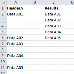 =IF(ROW(C1)>ROWS($A$2:$A$11)-COUNTBLANK($A$2:$A$11),"",INDEX($A$2:$A$11,SMALL(INDEX(($A$2:$A$11<>"")*ROW($A$2:$A$11)-ROW($A$2)+1,),COUNTBLANK($A$2:$A$11)+ROW(C1))))调整$A$2:$A$11以适应您的数据。确保在-ROW($A$2)+1部分中,$A$2是数据的第一个单元,即使它是空白的(重点是数据可能在那里,并且它不是头,它是公式应该查看的第一个单元格)。