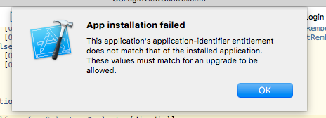 从您的iPhone中删除任何以前版本的应用程序,然后再清洁->构建并再次运行。您的应用程序应该在您的设备上顺利运行。