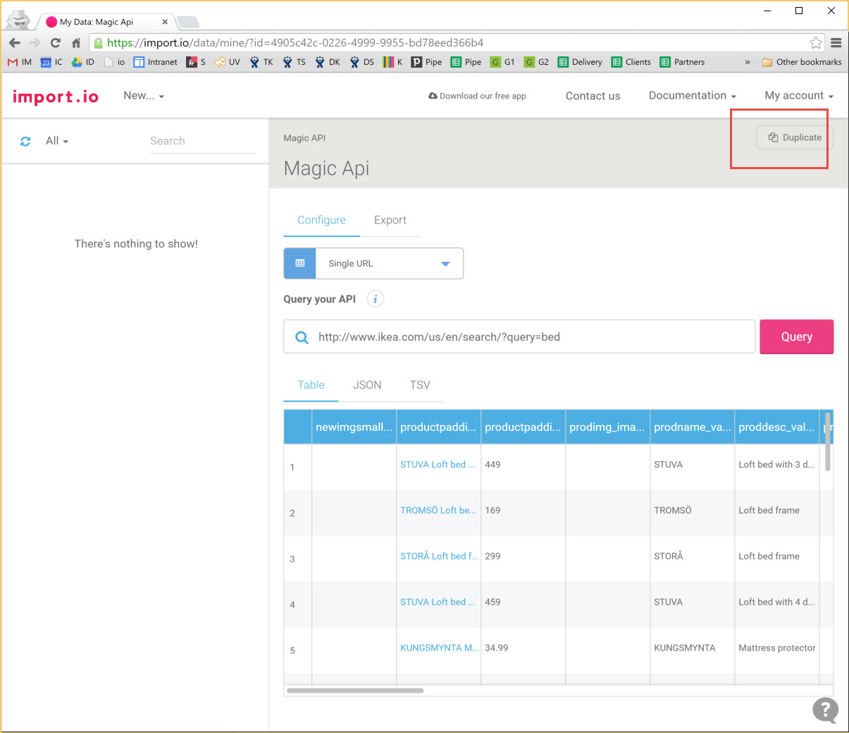 我从import.io上抓取了一些数据。这些数据都在我的import.io账户里。我还有一个import.io账户。现在我想把我以前帐户的数据转到我的新帐户上。我该怎么做呢?有可能吗?我找不到选择