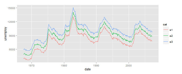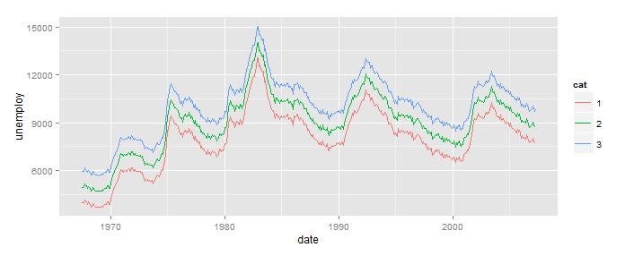 这将您的三个版本的economics放在一个长格式的data.frame中(1列中的所有数据,本例中的第二列cat,标识源)。一旦您这样做了,ggplot就会处理其他的事情。没有循环。