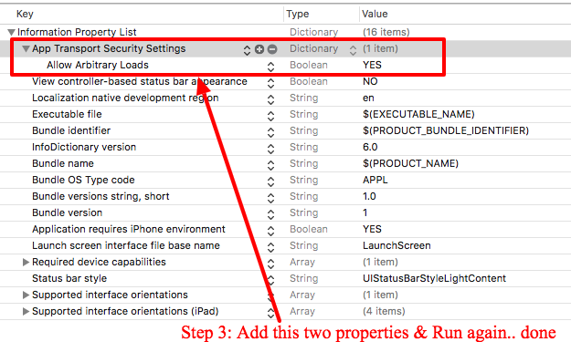 文档在这里允许与单个服务器的不安全连接。因此,您必须像show一样将NSAppTransportSecurity添加到您的info.plist文件中(要在源代码中显示Info.plist,在Xcode中右键单击Info.plist "Open“->源代码”)。