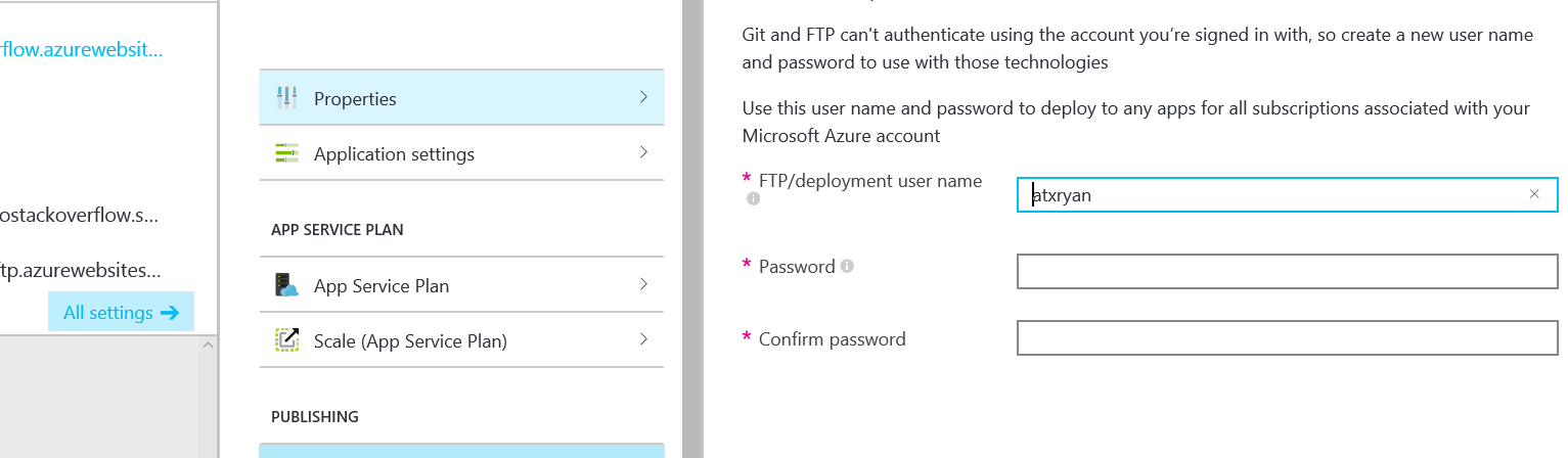 如果尚未这样做,则可能需要设置或重置部署凭据。您将在All Settings下找到这一点。这将是您的Git & FTP凭据。注意,这实际上是您的Microsoft帐户的凭据,而不仅仅是这个WebApp.。