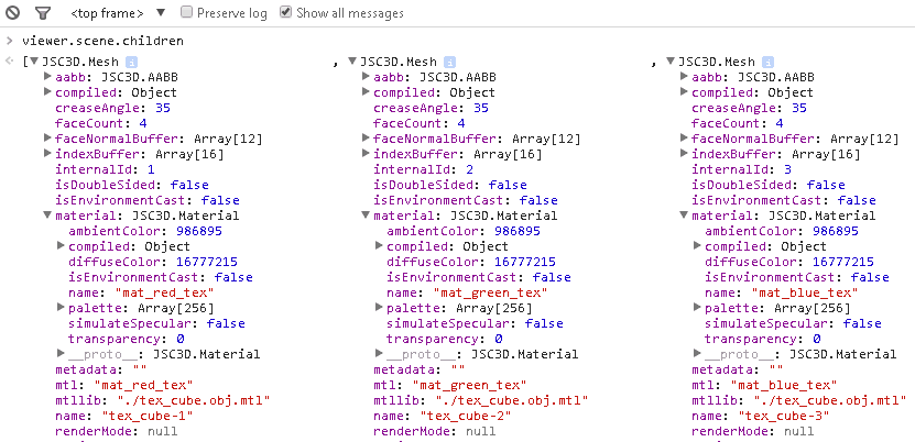 如果您在JSC3D查看器中加载这个多维数据集并检查viewer.scene.children[],您将发现3个网格,因为JSC3D已经将多维数据集的12个三角形分组为3个独立的部分,每个usemtl标记的一个位于obj文件中。