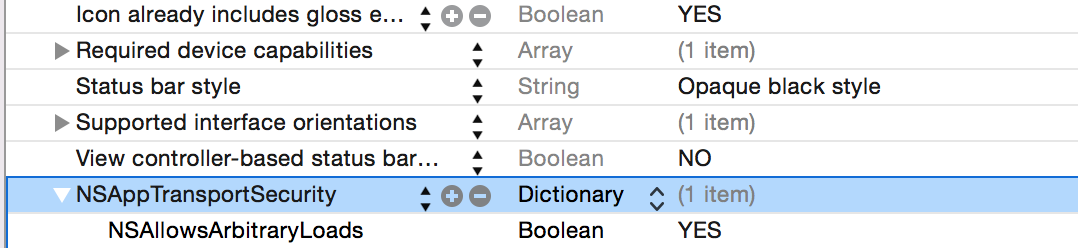 您应该再次检查是否将NSAllowsArbitraryLoads值标记为布尔值。这是一个有效的屏幕截图: