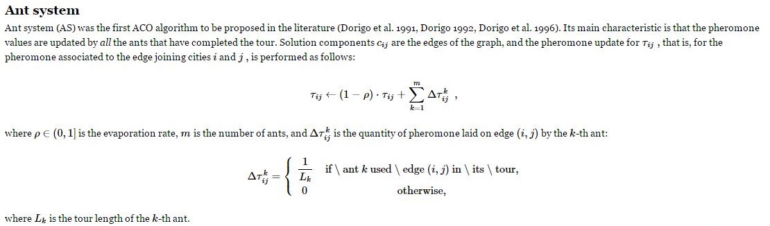 蚂蚁系统( Ant,AS)是文献中首次提出的蚁群算法(Dorigo等人)。1991年,Dorigo等人。(1996年)。它的主要特点是信息素值由所有已完成巡演的蚂蚁更新。解决方案组件c_{i,j}是图的边缘,\tau_{i,j}的信息素更新,也就是与城市i和j相连的信息素,执行如下: