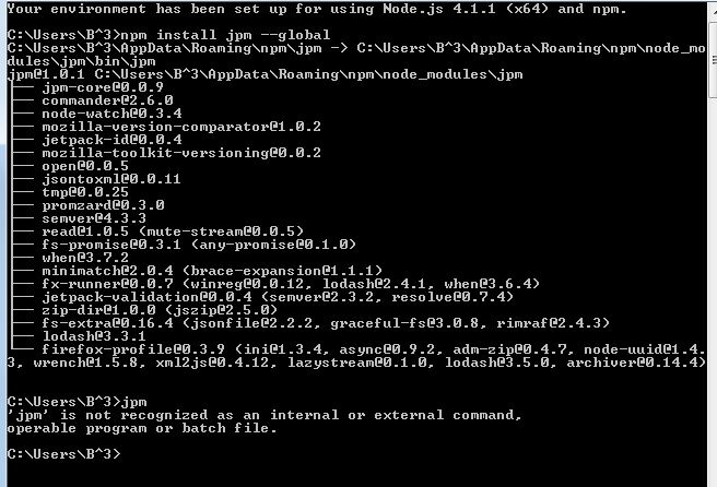 我试图写我的第一个firefox插件,但我似乎无法让jpm工作。我的操作系统是Windows 7,我已经安装了节点js,并且我正在按照这里的说明安装插件sdk。但是,在我安装jpm并尝试运行该命令之后,我得到的错误jpm无法识别为内部或外部命令、可操作的程序或批处理文件。
