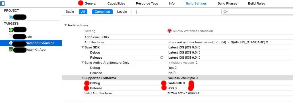 我读过in another post,需要对WatchKit扩展的体系结构设置(即调试-目标)进行不同的设置。