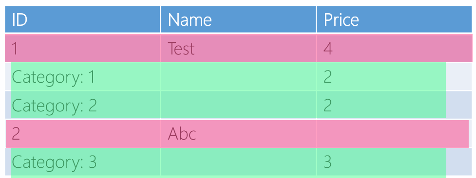 我有一个列表,上面有身份证,名字和价格。每个这样的项目都有一个包含类别的子列表。