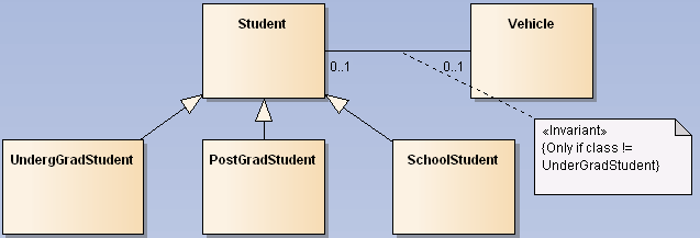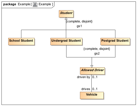 Student的有效实例必须是School Student、Undergrad Student或Postgrad Student的实例(而不是乘法分类)。Allowed Driver的有效实例必须是Undergrad Student或Postgrad Student的实例(且不能乘以分类)。Vehicle可以由最多一个Allowed Driver驱动(一次)Allowed Driver最多可驱动一个Vehicle (一次)这描述了一个有效的情况,在任何时候,这是真正有用的。把它看作是一种评估电影中任何帧的有效性的方法。