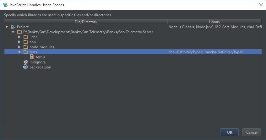 当使用在可见的JavaScript代码之外定义自己的全局符号的库(例如,在Mocha中的definition ())时,建议将相应的TypeScript类型定义文件添加为Preferences & Frameworks JavaScript库中的JavaScript库。
