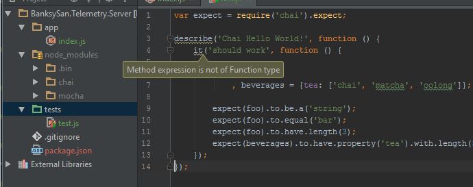 我承认我在这里是个书呆子。我在WebStorm中做了一个摩卡测试,WebStorm抱怨describe()和it()不是函数类型。