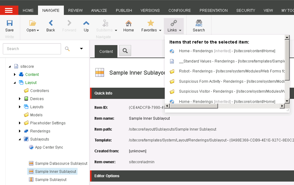 请注意,如果您在该列表中看到任何__Standard Values项,您的子布局也可能被使用该模板的项所使用。