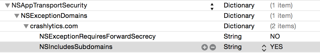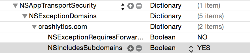 确保对于您使用的每个NSExceptionDomains,字典的子字段(例如NSIncludesSubdomains、NSExceptionRequiresForwardSecrecy和NSExceptionAllowsInsecureHTTPLoads)都被设置为键入布尔,而不是String。虽然XCode可以显示是和否的值,但这种类型对于确保CFNetwork能够理解您的配置而没有任何错误非常重要。