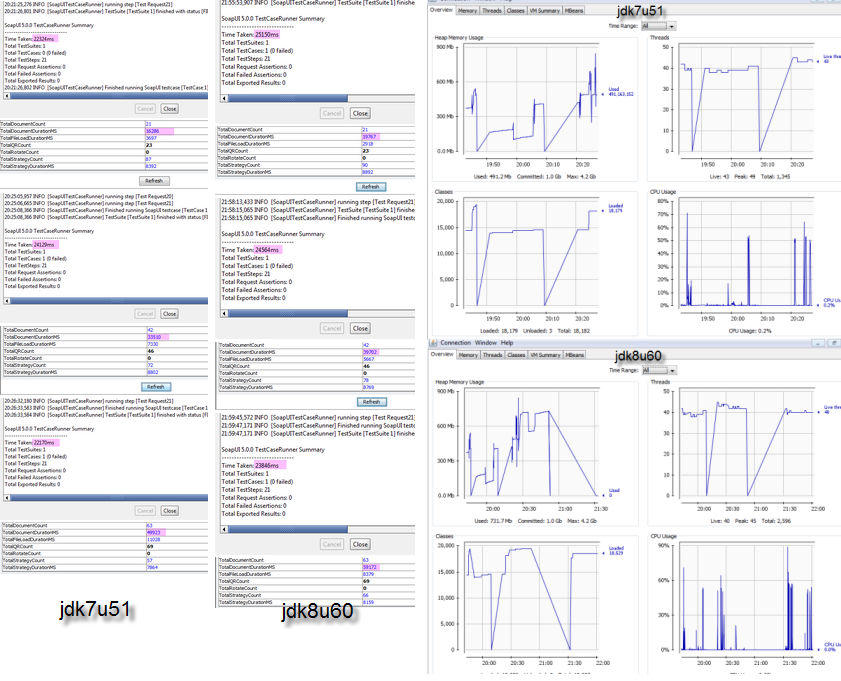 针对WLS 12.1.3运行的resp启动了21个SOAPUI (并行)测试。在我的测试环境中,Java 7u51(*)和Java 8u60。