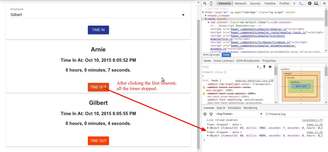 我有一个使用角定时器的应用程序,尽管是,但是我很难停止一个单一的计时器。当我点击超时的第一个,定时器它停止他们所有。