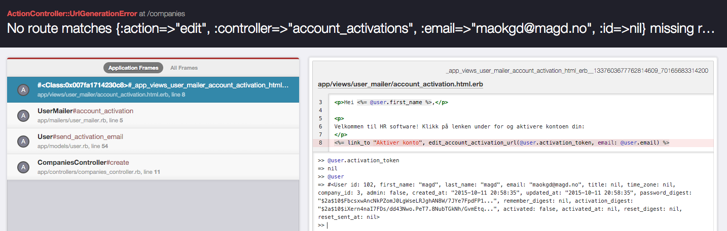 我正在努力解决Hartl教程的一个问题(我已经添加了自己的自定义需求,即用户属于公司,创建表单是company#new)。现在一切都正常了,比如密码重置等等,除了一件事就是activation_token方法。