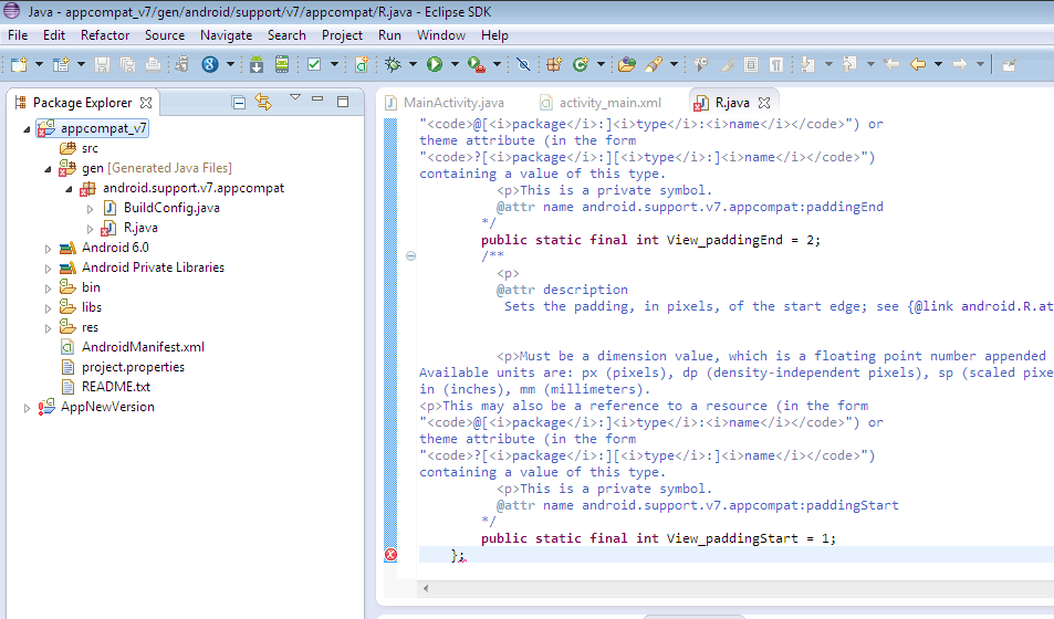 Syntax error, insert "}" to complete ClassBody R.java /appcompat_v7/gen/android/support/v7/appcompat line 3065 Java Problem