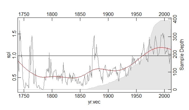 > doubleYScale(Plot2a, Plot2b)我的最终目标是为我的dplR中的每个站点生成一个与data.frame输出类似的图形: