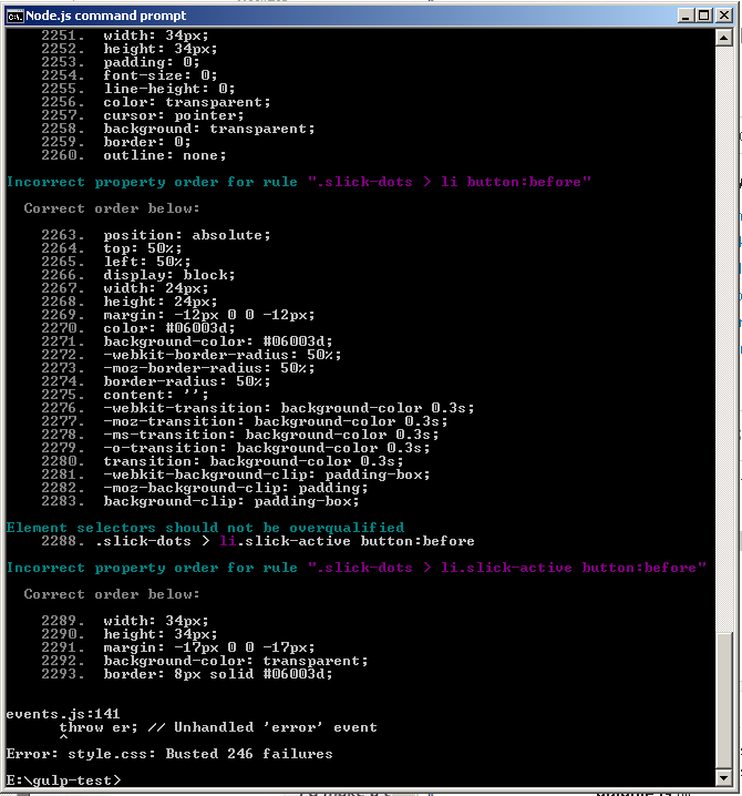吞咽不会重新排序您的css属性,它的目的是'lint‘您的css/less文件-检查语法错误,这样您就可以自己修复源文件中的警告/错误。