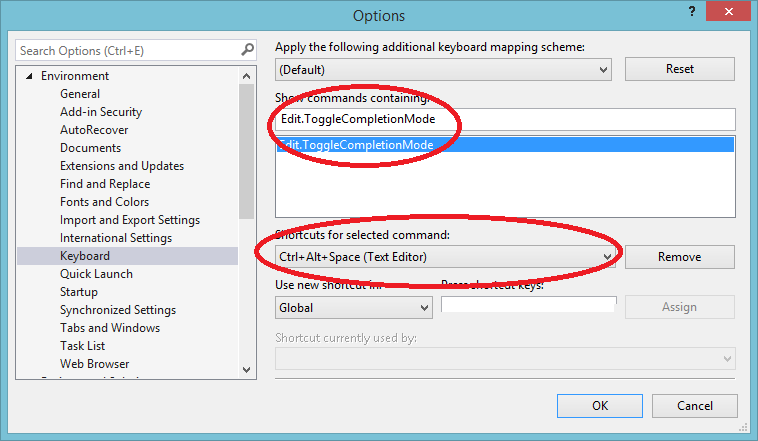 在这里,找到命令Edit.ToggleCompletionMode并指定您想要的键盘快捷方式。