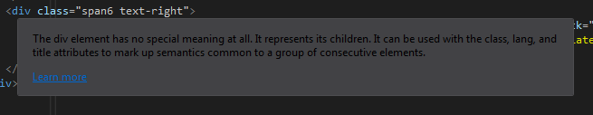 我想知道是否有人在Visual 2015中禁用了HTML元素工具提示。我发现它们是一个真正的烦恼,特别是当拖拽/ctrl+拖动文本时(它们大部分时间都会妨碍)。下面是一个屏幕截图,这个功能正在运行(更新):