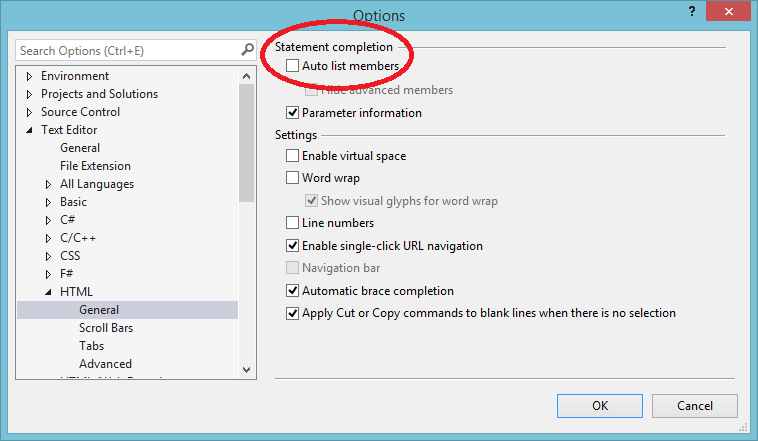 在“语句完成”部分中,您将看到“自动列表成员”复选框,取消选中它。
