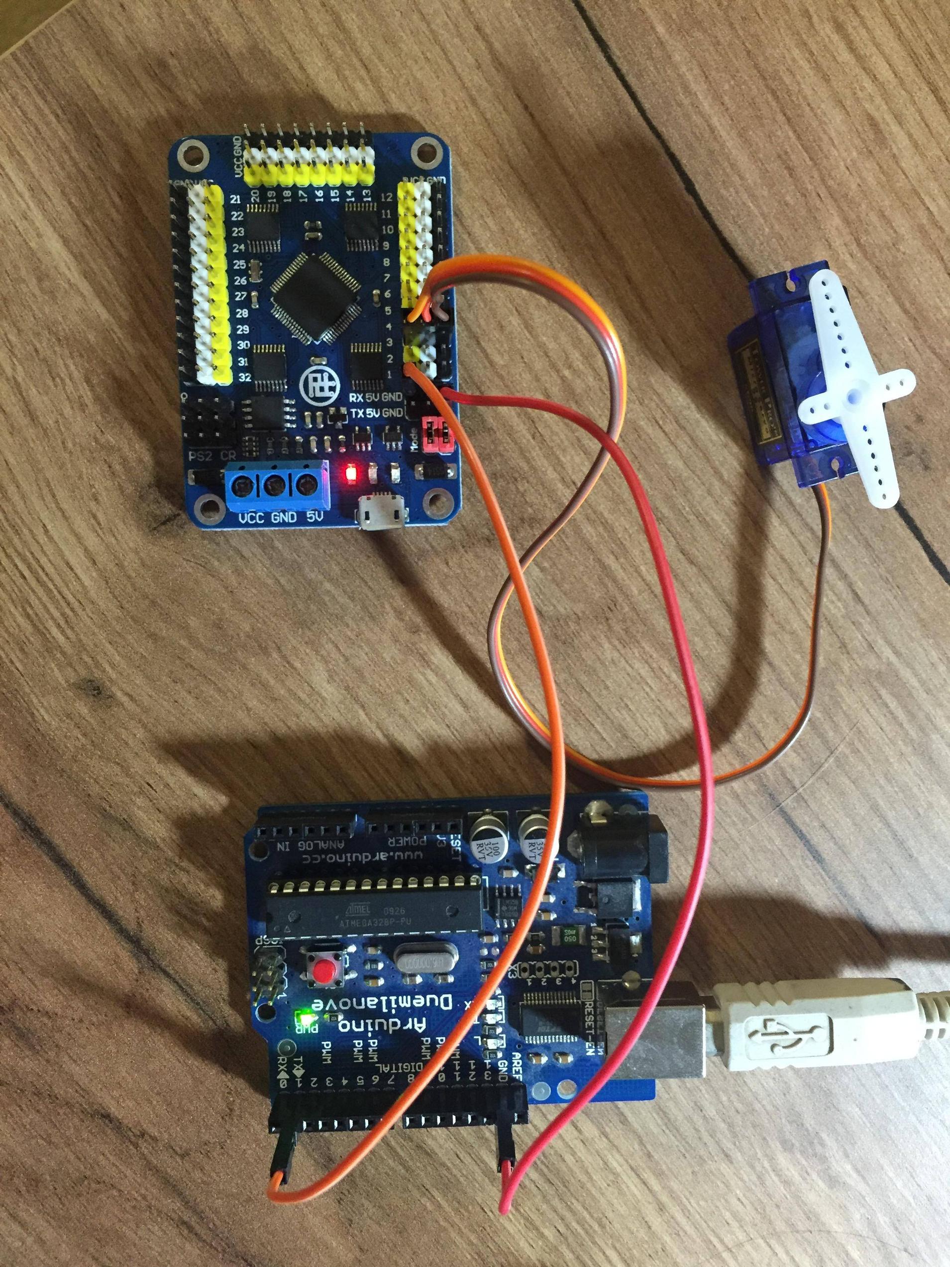 伺服工作如果我间接连接到Arduino。控制器表示,它也在工作(照片下红色的led)。