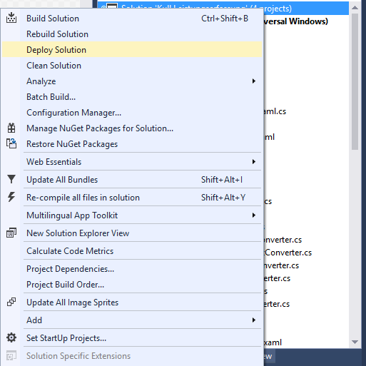 更改Debug x86,设置Debug 任意CPU,然后右键单击UWP项目并选择Deploy (第三个选项,在“重建”下)