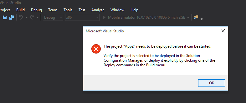 项目app1需要在启动之前进行部署。验证选择了要部署解决方案配置管理器的项目,或者通过单击生成菜单中的一个部署命令显式地部署它。
