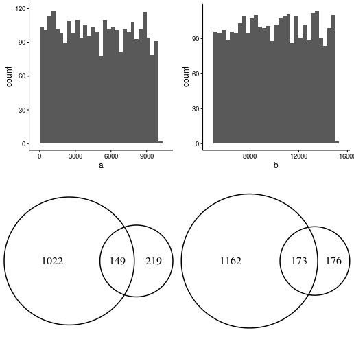 是否有一种方法可以将下面的venn图作为下面两个柱状图之后的第三个图??我想把两张维恩图放在另一张上面
