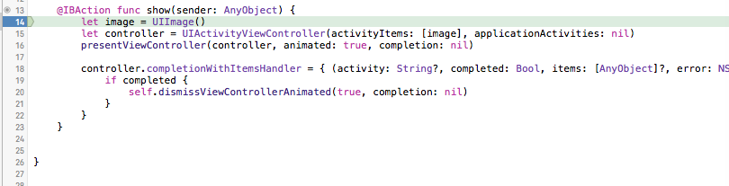 controller.completionWithItemsHandler = { (activity: String?, completed: Bool, items: [AnyObject]?, error: NSError?) -> Void in