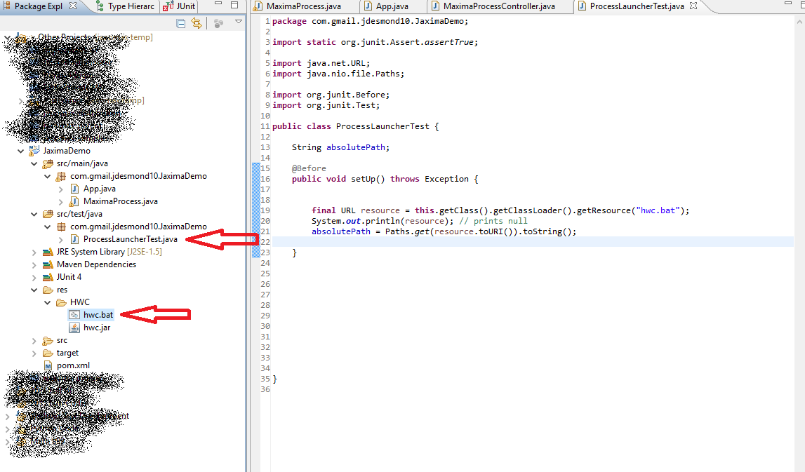 由于您使用的是Maven项目,将文件放置在src/main/resources中的正确位置是为了通过ClassLoader.getResource("hwc.bat")找到它。