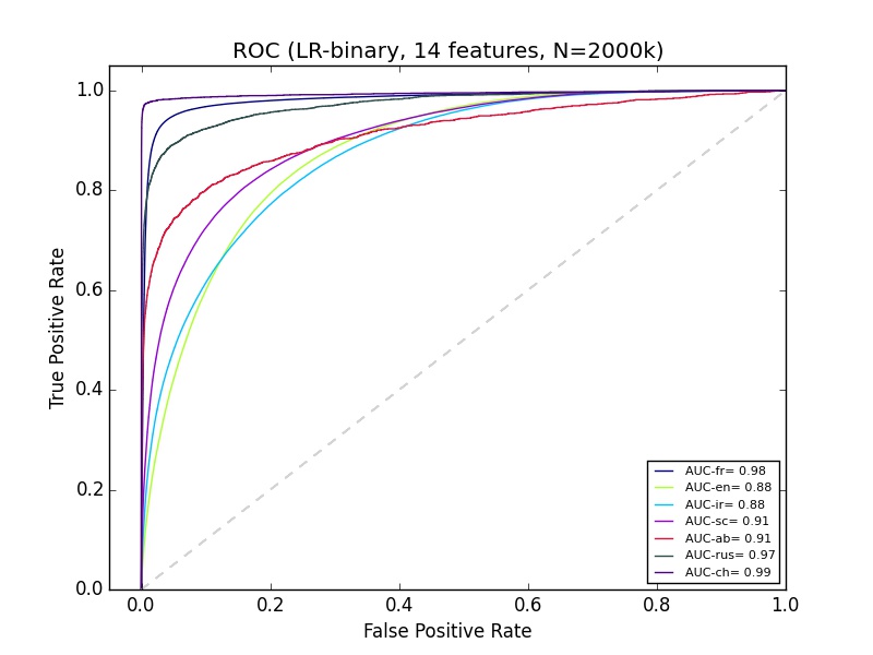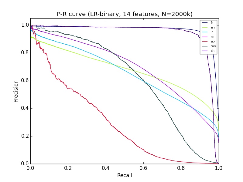 我有些机器学习的结果我不太明白。我正在使用python学习,拥有大约14个特性的2+百万数据。“Ab”的分类在精确召回曲线上看上去相当糟糕,但是ROC对于Ab的分类和大多数其他组的分类一样好。有什么可以解释的?