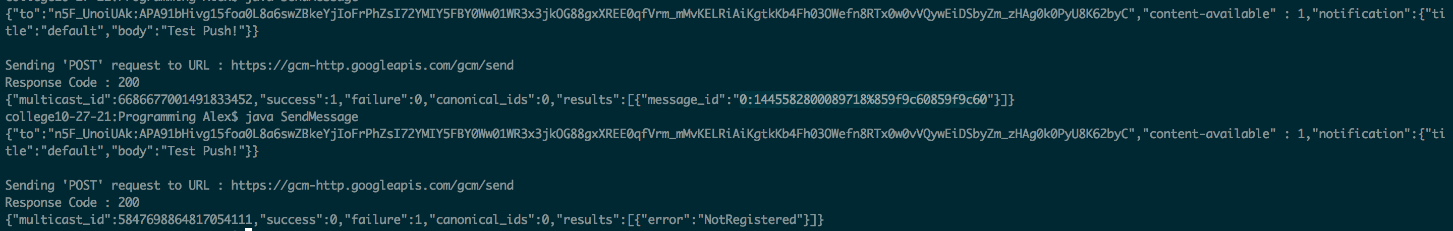 我已经用了很长时间的GCM了。有一天它突然破了。问题是,我发送的第一个推送返回成功状态,但应用程序没有收到任何推送。我发送的第二个推送由于NotRegistered错误而失败。我重新安装了应用程序:成功(没有收到通知),失败(NotRegistered) ->循环。我不知道什么改变了。谷歌的支持是非常无助的,并花费大量时间回答简单的问题,无论是GCM问题,APN问题还是客户端问题。如果以前有这样的问题,请告诉我要找什么。这就是它的样子:
