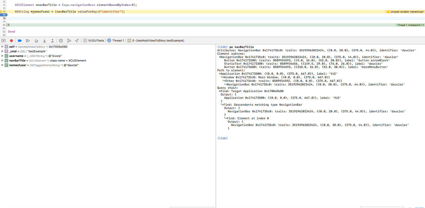 XCUIElement *navBarTitle = [app.navigationBars elementBoundByIndex:0];然后在创建navBarTitle对象之后放置一个断点,并使用调试控制台输出navBarTitle对象的详细信息: