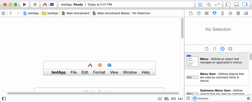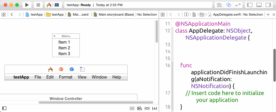 如果您想将菜单挂在状态栏项目上,您可以(从Xcode 7开始)在故事板中创建菜单。将NSMenu拖到应用程序场景中: