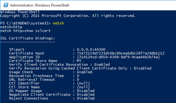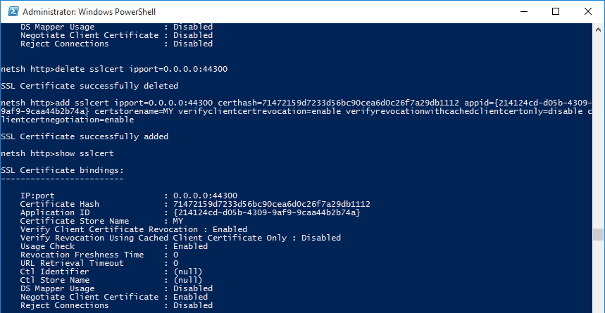 delete sslcert ipport=[IP:port from above]add sslcert ipport=[IP:port from above] certhash=[certificate hash from above] appid={[any random GUID (can be the same one from the show sslcert output)]} certstorename=MY verifyclientcertrevocation=enable verifyrevocationwithcachedclientcertonly=disable clientcertnegotiation=enableshow sslcert来确认此操作是否有效。您应该会看到一个几乎相同的输出,但是将协商客户证书设置为已启用: