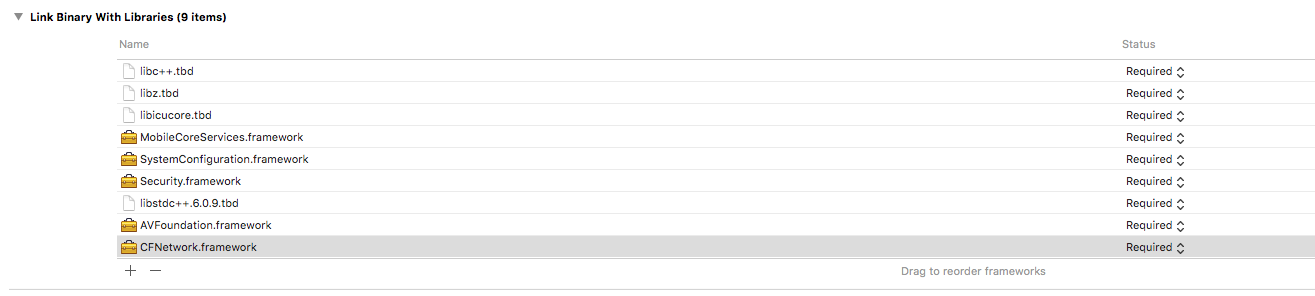 -cxx -gcc_flags "-L${ProjectDir} -framework CFNetwork -framework SystemConfiguration -framework MobileCoreServices -framework Security AVFoundation -libicucore -libxml2 -libc++ -libzd -libstdc++.6.0.9“