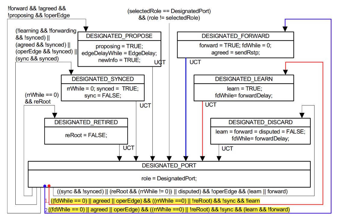 在边缘端口(即,operEdge == TRUE)的情况下,当链接打开时,端口状态将作为红线和条件1从DESIGNATED_DISCARD过渡到DESIGNATED_LEARN,如下图所示,然后在眨眼之间移动到DESIGNATED_FORWARD,作为条件2和蓝线。它跳过了fdWhile (前向延迟)时间。