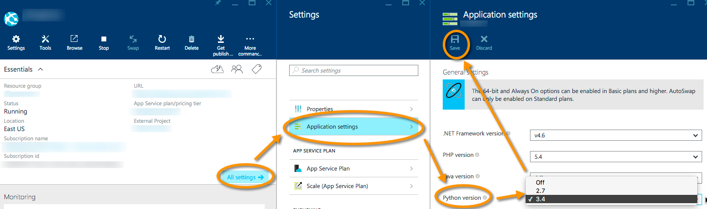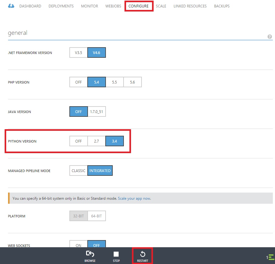 在Azure Web应用程序的管理门户中,在configure选项卡的常规部分下,我们可以指定将在Web运行时中配置的python版本。保存配置后重新启动站点。
