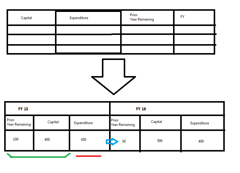在这里,我想从这个公式得到16财政年度剩余金额(财政年度15先期金额+财政年度15资本-财政年度15支出)。如果我计算成组变量,它只适用于那个FY,因为我不能从前一年的FY中得到。