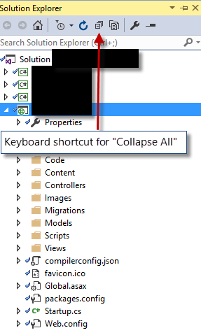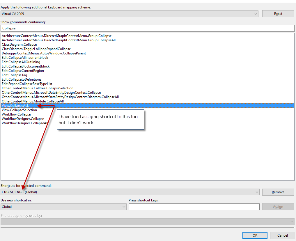 要映射的命令是SolutionExplorer.CollapseAll。诀窍是,除非解决方案资源管理器有焦点,否则它将无法工作,因此您必须首先使用击键来设置焦点(例如Ctrl+Alt+L),然后再使用您定义的第二个击键。之后,转义键将焦点返回到以前的窗口(例如,代码编辑器)。