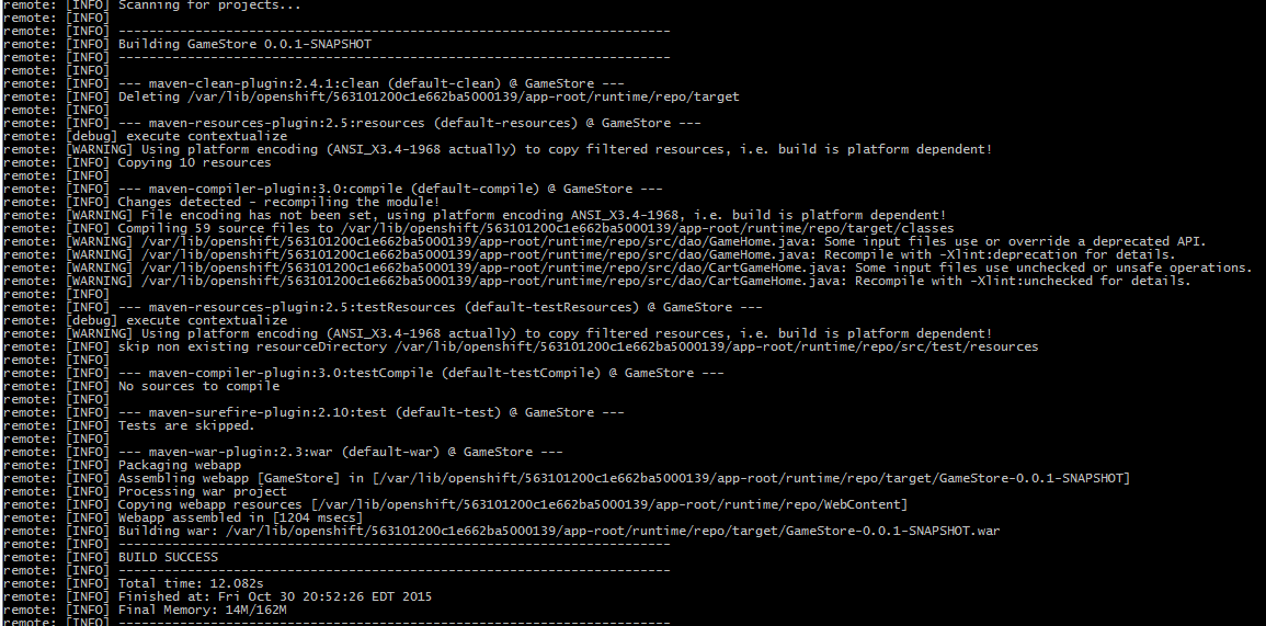 cp app-root/runtime/repo/target/GameStore-0.0.1-SNAPSHOT.war app-root/dependencies/jbossas/deployments/ROOT.war