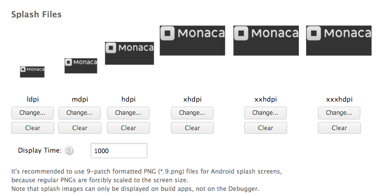 要更改Monaca默认启动屏幕,需要转到Config -> Android App Settings。您将看到有一个名为Splash files的部分,如下所示: