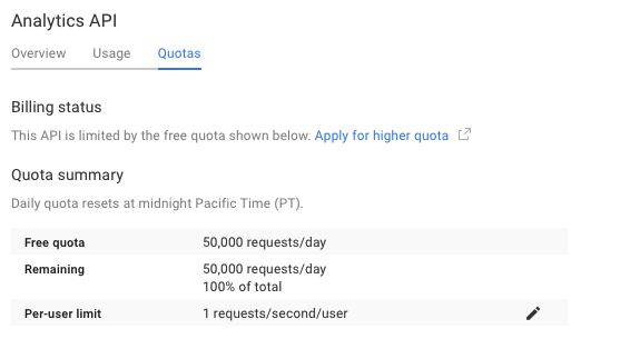 在那里,您可以看到默认的1 query per second 每个用户限制。你也可以看到一个申请配额增加的表格的链接-仔细阅读表格并回答每一个问题。