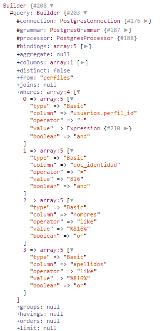 })->get();所以,我想要过滤每一个Usuario和运行非常好的工具,然后我想过滤其中的doc_identidad或者nombres或者apellidos,就像你看到的那样,我有一个dd($query)来查看查询的树,我注意到第一个where使用,而不是或者。这是一棵树