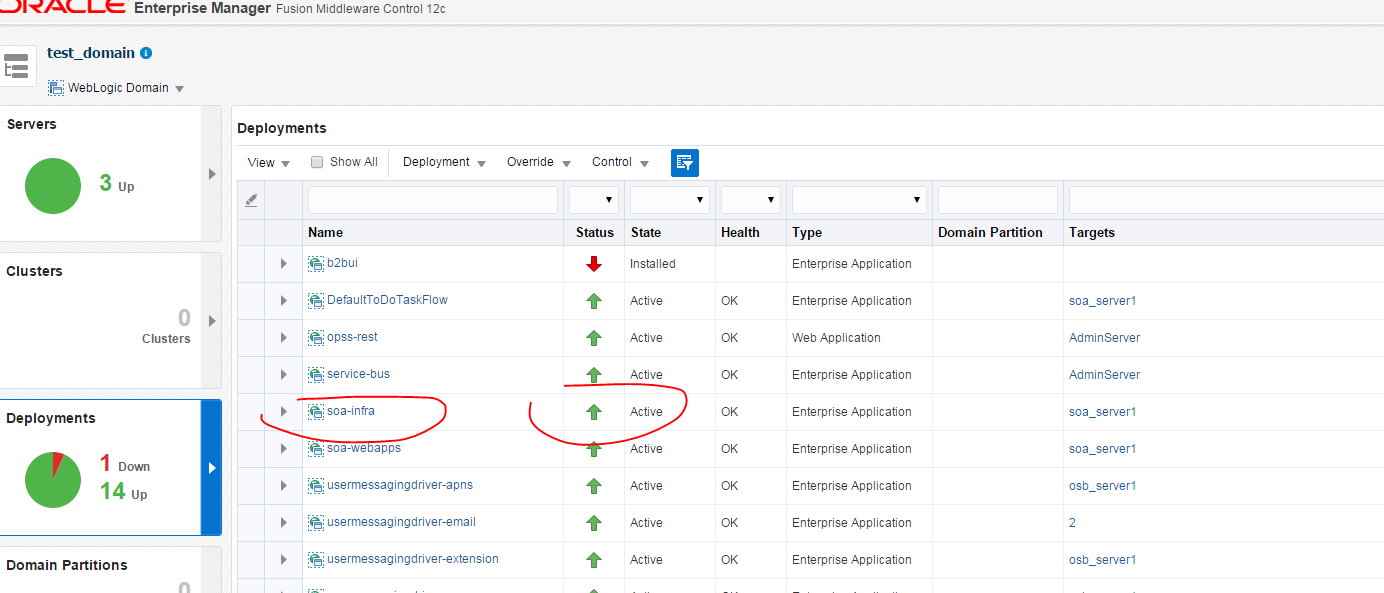 在em中,它显示服务器已启动,而SOA下的服务器处于活动状态。这是12.2的版本。