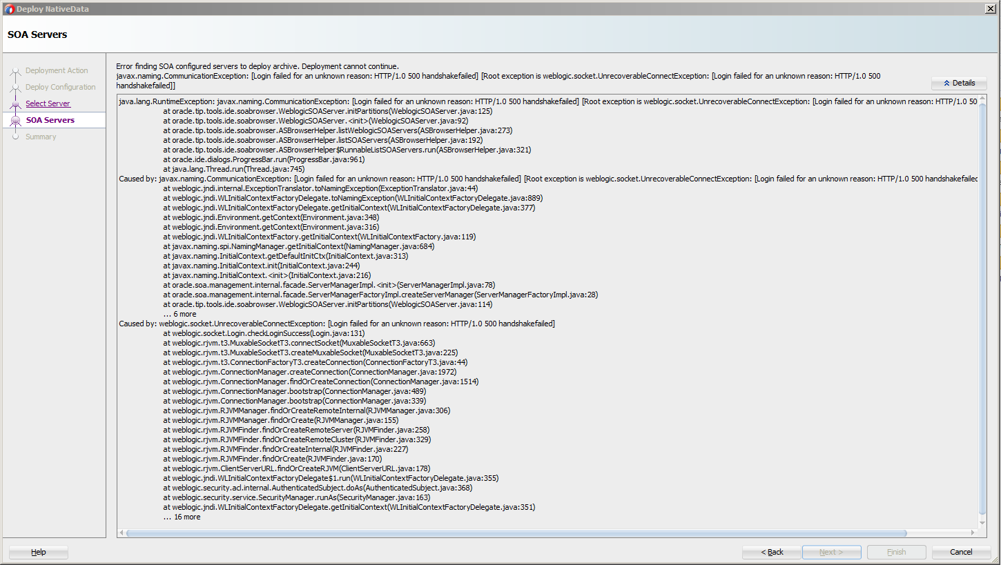 我已经配置了独立的服务器,当在上面部署OSB项目时,它可以正常工作,但是当我试图部署SOA项目时,它挂在“查找SOA服务器”处,然后得到这个错误消息。有人知道这是怎么回事吗,谢谢。