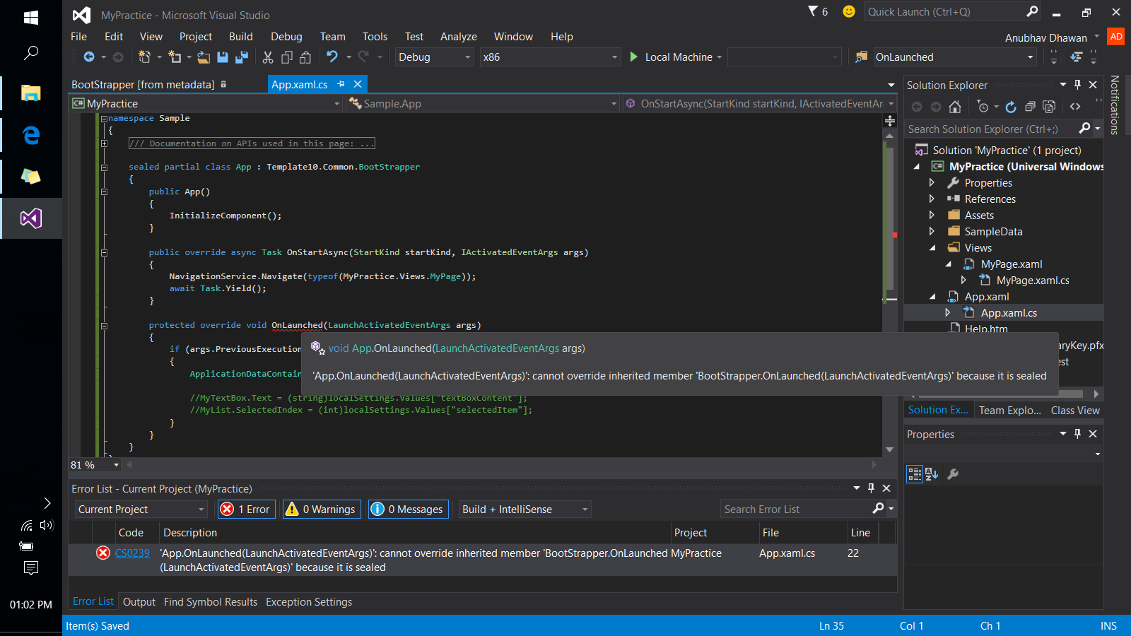 }我无法从OnLaunched()中删除BootStrapper中的密封修饰符(猜测是因为它是“从元数据中删除的”)。